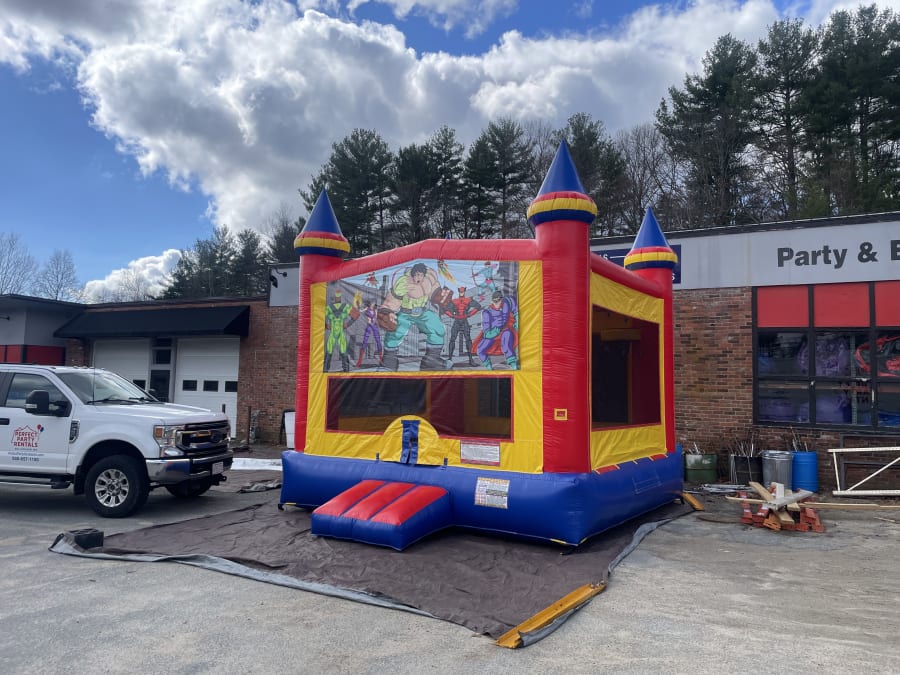 Bounce house rentals Castle Bounce House W/ Super Hero Panel in Ashland, Attleboro, Bellingham, Blackstone, Canton, Cumberland RI, Dover, Douglas, Franklin, Foxborough, Framingham, Grafton, Holliston, Hopkinton, Hopedale, Mansfield, Medfield, Medway, Millis, Mendon, Marlborough, Milford, Millville, Norfolk, Northbridge, North Attleboro, North Smithfield, Norwood, Plainville, Southborough, Sherborn, Upton, Uxbridge, Worcester, Westborough, Wrentham, Walpole, Webster, Westwood and Woonsocket